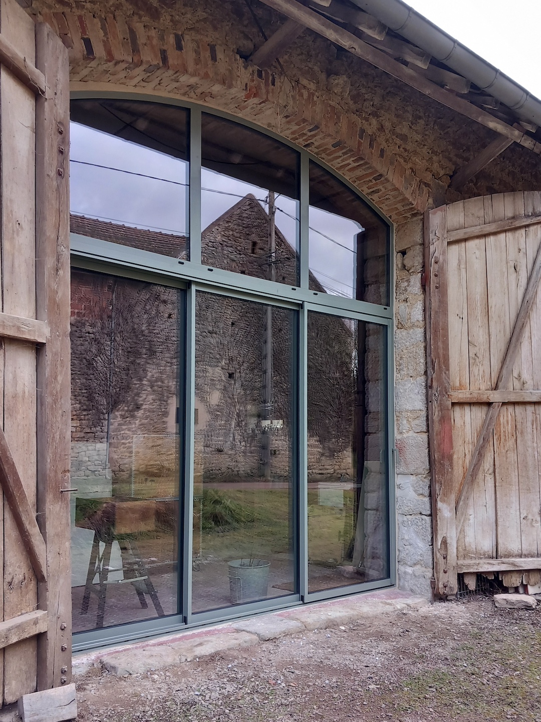 La baie vitrée a pris sa place dans l’ouverture de la grange – alias l’atelier. La deuxième étape de ce projet se met donc en place… À suivre !